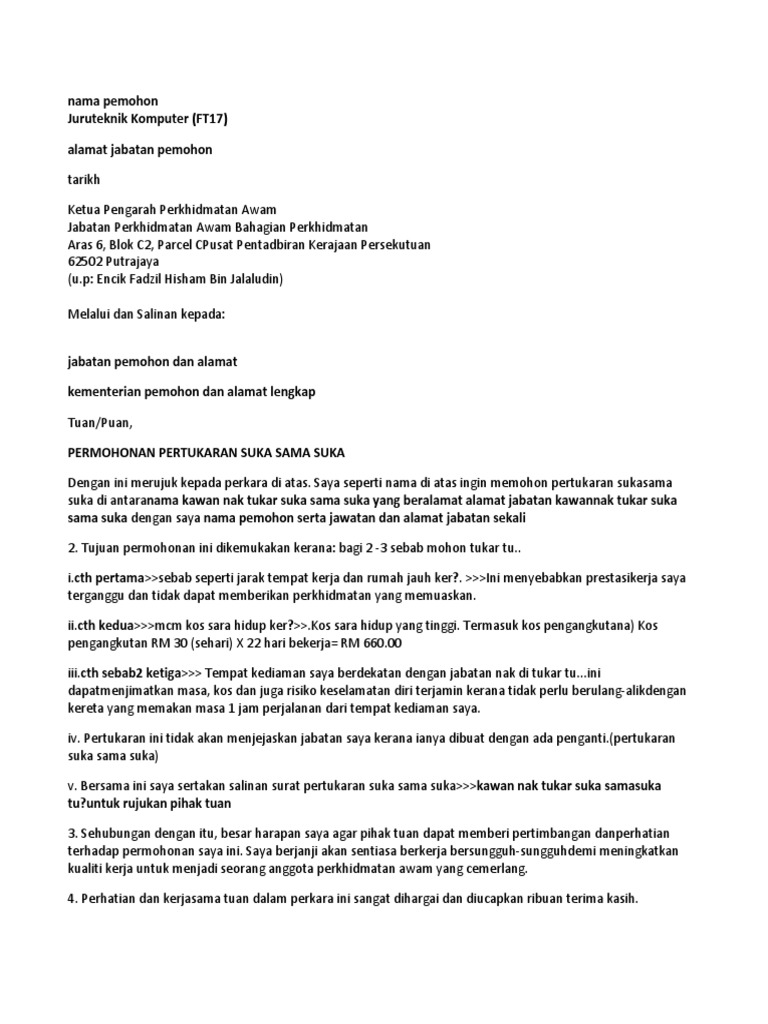 Contoh Surat Rayuan Pertukaran Tempat Kerja Kerajaan Surat Rasmi U