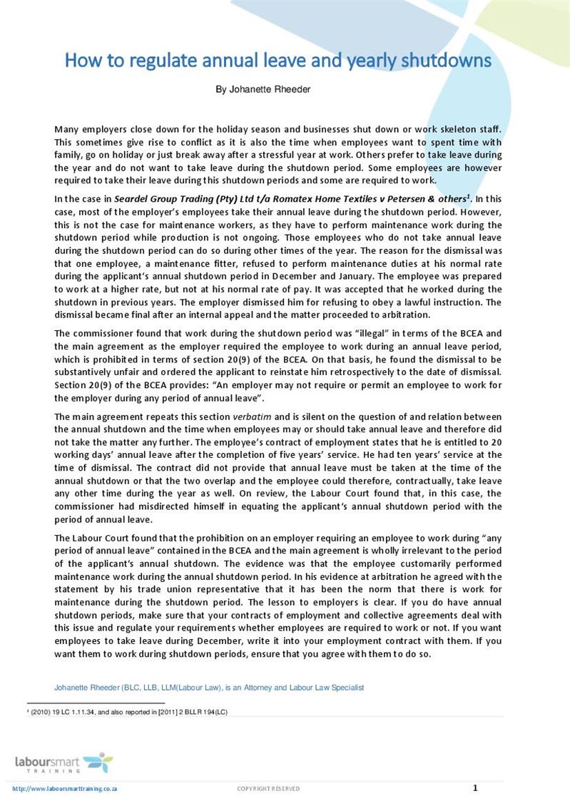 How To Regulate Annual Leave And Yearly Shutdowns Document Labour Law South Africa Pdf Download