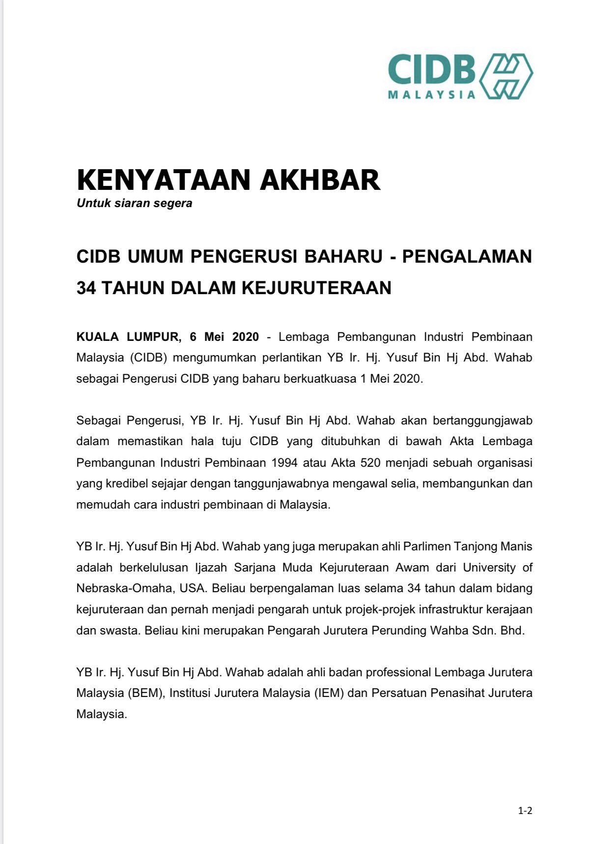 Tvsarawak On Twitter Cidbmalaysia Umum Pengerusi Baharu Lembaga Pembangunan Industri Pembinaan Malaysia Cidb Mengumumkan Pelantikan Ir Yusuf Abdul Wahab Sebagai Pengerusi Cidb Yang Baharu Berkuatkuasa 1 Mei 2020 Tvsarawak Https T Co Rpynlutrd4