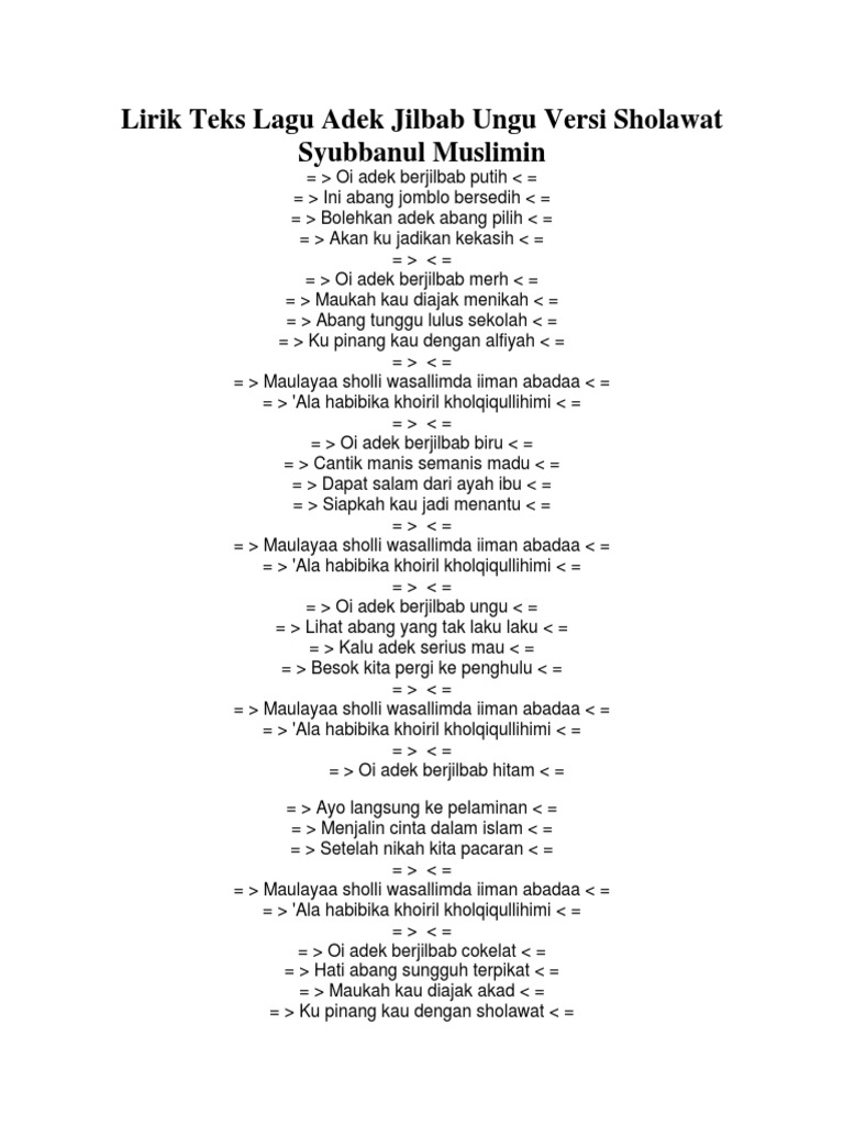 Lirik Teks Lagu Adek Jilbab Ungu Versi Sholawat Syubbanul Muslimin Islamic Belief And Doctrine Abrahamic Religions